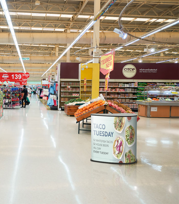 El Mostrador Publicitario Riñon es un soporte publicitario muy práctico, ya que se monta y desmonta en pocos minutos sin necesidad de herramientas mediante un sistema de velcro. Además incluye bolsa de transporte para que sea más fácil manipularlo. Su estructura es de madera y plástico. Este soporte publicitario es excelente para ferias y eventos promocionales en tiendas o presentaciones comerciales.